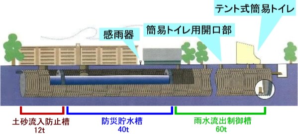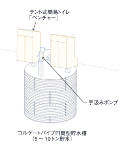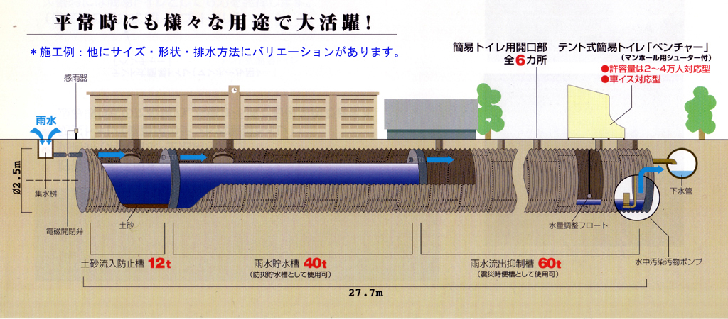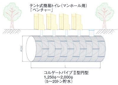 | 内部仕切りの無いタイプです。 通常時は雨水等を貯水し防火水槽として。災害時は貯留水をポンプアップし、 上部マンホールに簡易トイレを設置して避難所トイレとして活用できます。 |